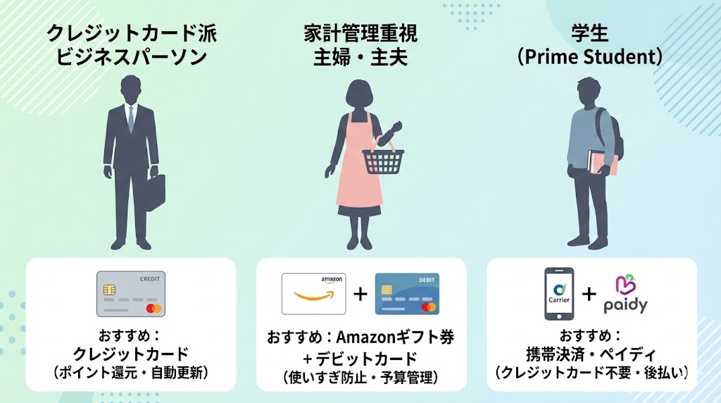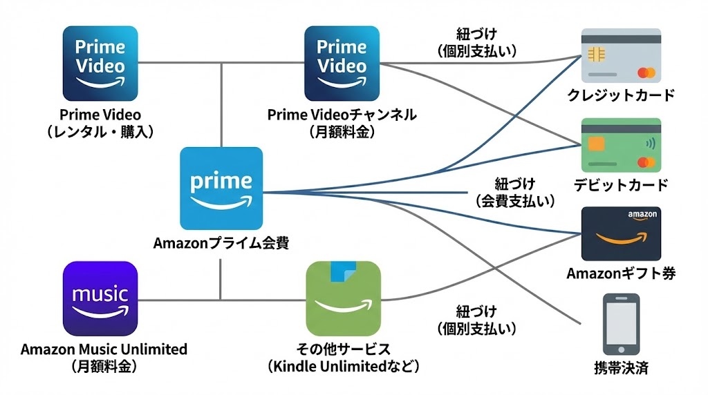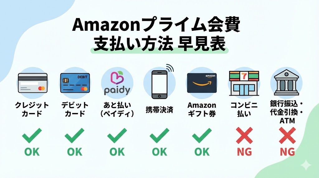 まず押さえておきたいのは、「Amazonに登録できる支払い方法」と「プライム会費の支払いに使える支払い方法」は、ほぼ重なりつつも一部条件が違うという点です。