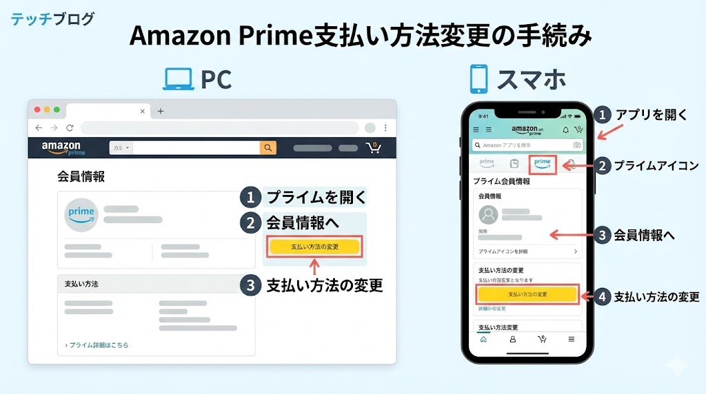 A. アカウントサービスから「プライム」を開き、プライム会員情報ページの「支払い方法の変更」ボタンから操作するのが近道です。スマホの場合も同じ流れでメニューからプライムを探すと見つけやすくなります。