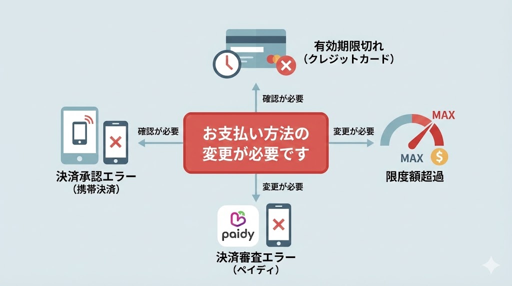 - 「お支払い方法の変更が必要です」表示が出るときは、カードの有効期限・限度額と、ペイディやキャリア決済の利用可否を順番に確認すると原因を絞れます。