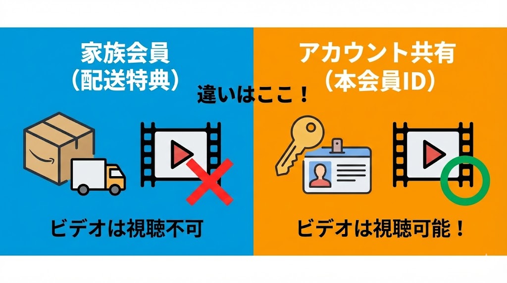 最も重要なポイントは、「配送特典の家族会員」と「ビデオ視聴のアカウント共有」は仕組みが全く異なるという点です。