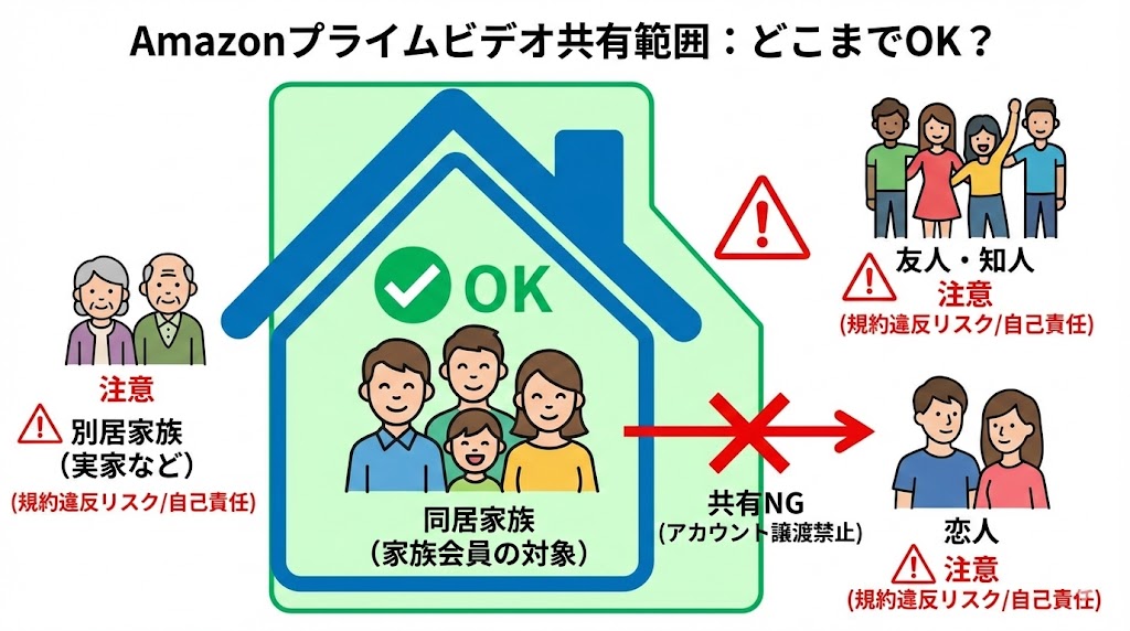 Amazonの公式ルールでは、共有は「同居家族」に限定されています。たとえ家族でも、住所が違う場合は本来の対象外となることを理解しておきましょう。