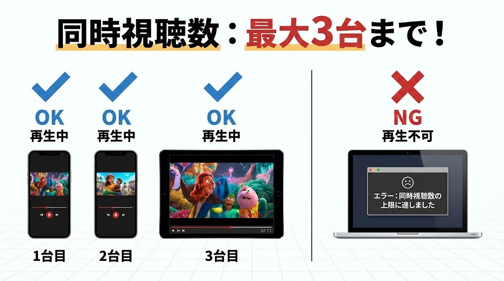 たとえアカウント全体の視聴数が3台以下であっても、同じ作品へのアクセスが集中するとエラーになる点に注意が必要です。