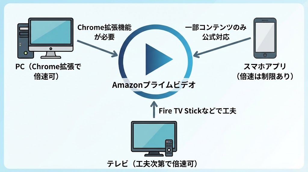 ここまで、プライムビデオを倍速で見るための現実的なルートを、PC・スマホ・テレビごとに整理してきました。