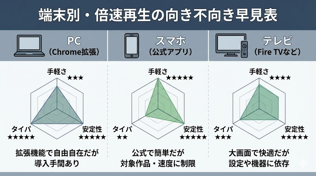 どの端末で何ができるのかを整理しておくと、「この作品はPCでサクッと1.5倍」「家族で見るときはテレビでゆっくり」といった使い分けがしやすくなります。