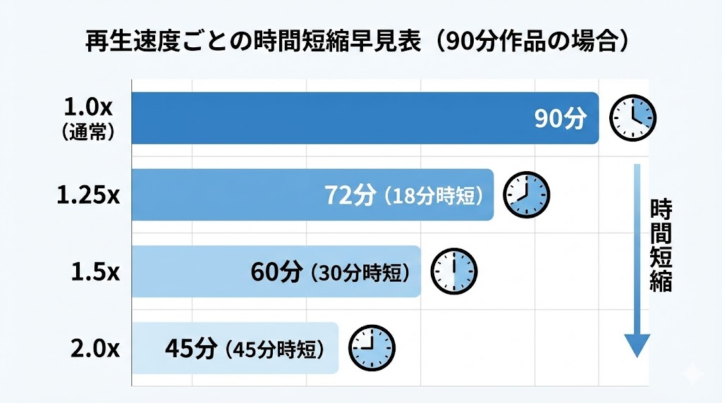 - 1.25〜1.5倍速なら、多くの人が無理なく使いやすく、90分作品で20〜30分ほどの時短も狙えます。