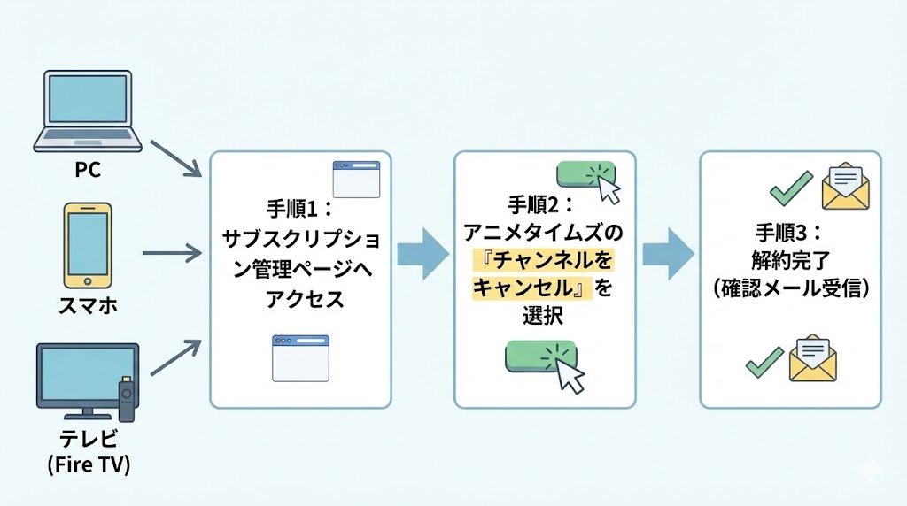 アニメタイムズの解約は、「Amazonのサブスクリプション管理」や「Prime Videoのチャンネル管理」から行うのが一番確実で、ブラウザ経由であれば数ステップで完了します。