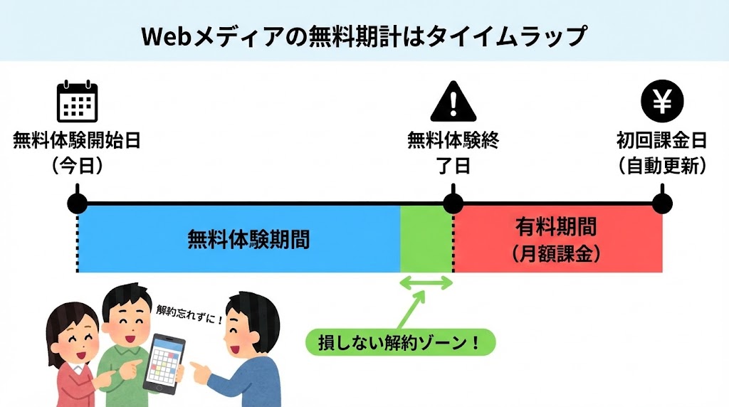 無料体験の終了日と、その翌日から課金が始まるというイメージを持っておくと、スケジュール管理がしやすくなります。