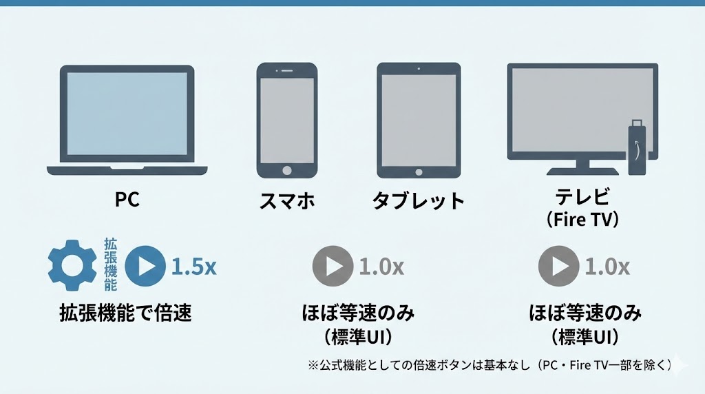 2025年末時点で、Prime Video本体には一般的な倍速ボタンが用意されていないことが多く、特にPC以外では「等速が基本」という前提があります。