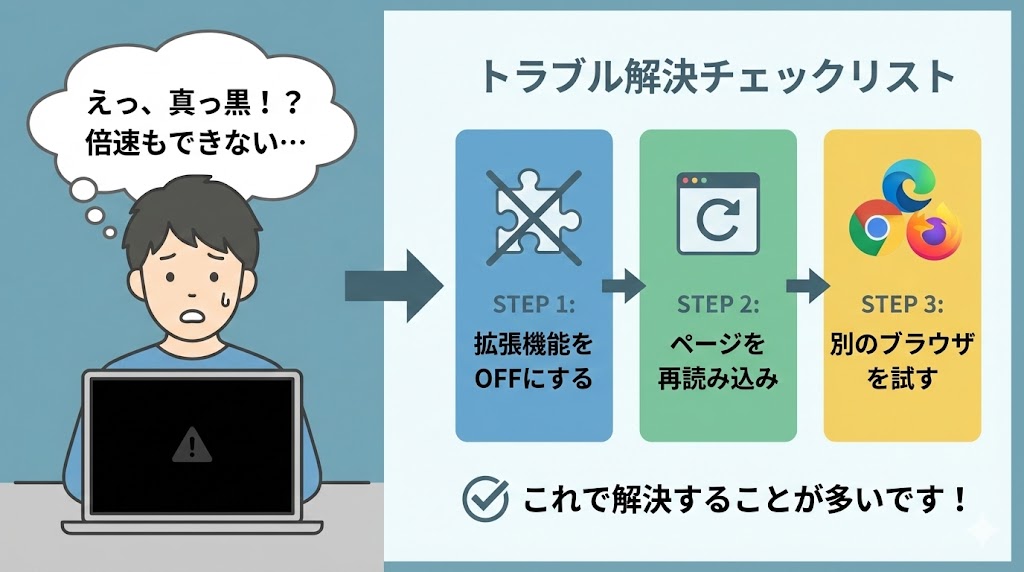 A. まず倍速系拡張機能を一度オフにして、ページを再読み込みしてみるのがおすすめです。それで直る場合は拡張との相性が原因のことが多く、別の拡張に変えるか使用を控える判断がしやすくなります。