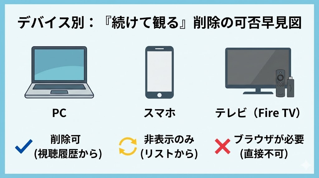 ここでは、よく使われるデバイスごとに「続けて観る」に対してどこまで操作できるのかをざっくり整理します。