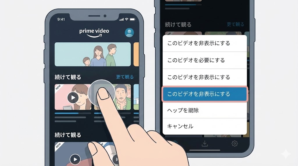 「続けて観る」から作品を消したいときに、画面上では「非表示にする」や「視聴履歴から削除」といった似た文言が並ぶことがあります。