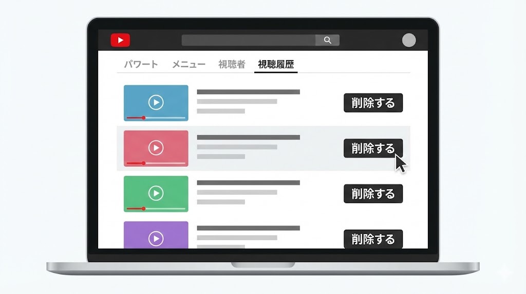 ホーム画面だけをスッキリさせたいなら「非表示」でも十分ですが、「見たこと自体をなかったことにしたい」「おすすめの傾向をリセットしたい」という場合は、視聴履歴の削除まで行う必要があります。