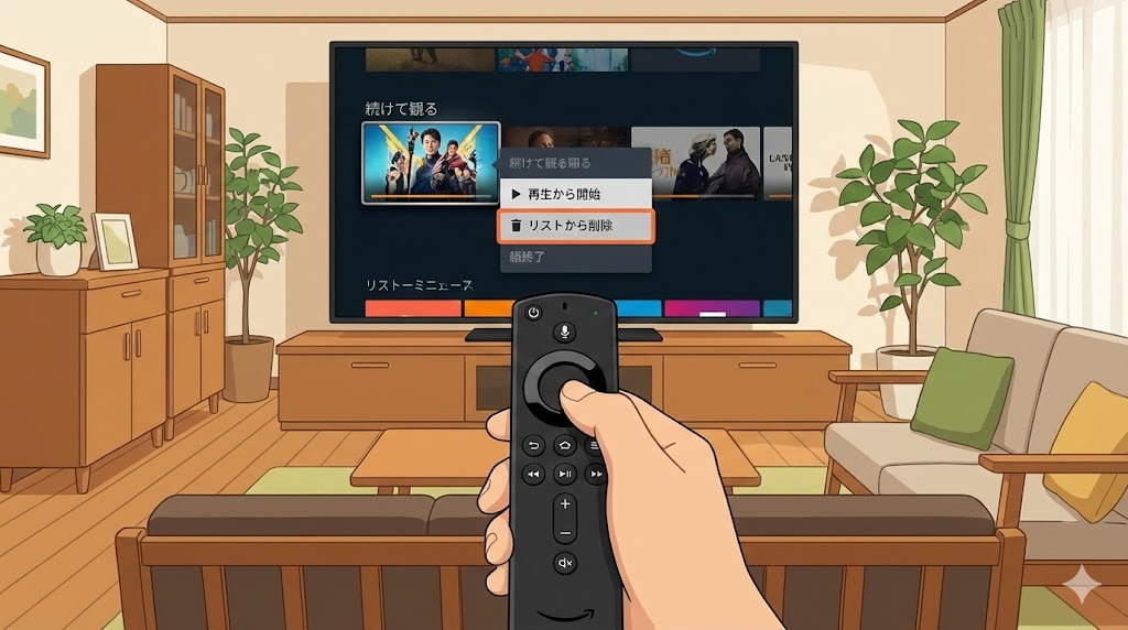 A. まずはFire TVのリモコンで対象作品を選び、メニューボタンから「リストから削除」を実行します。それでも残る場合は、PCブラウザの視聴履歴画面で該当作品を削除し、Fire TV側を再起動して反映を待つと改善することが多いです。