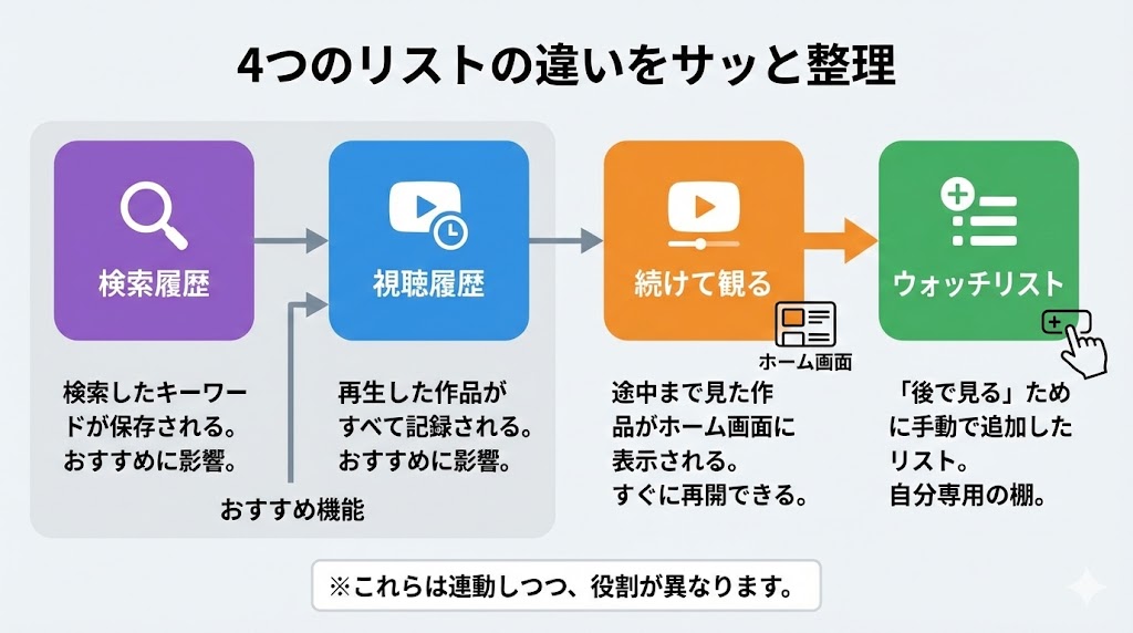 - 「ウォッチリスト」「視聴履歴」「続けて観る」「検索履歴」は、それぞれ役割が違う別のリストです。