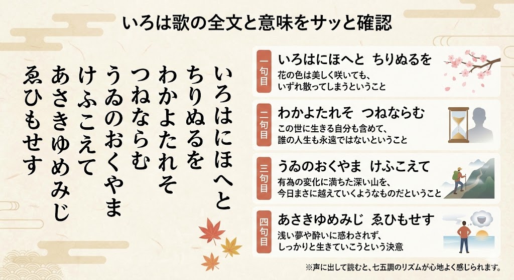 いろは歌は仮名47文字を一度ずつ使った四句の歌で、美しいものも人生も移ろうという無常観と、それでも惑わされず生きようという静かな前向きさを同時に語っています。