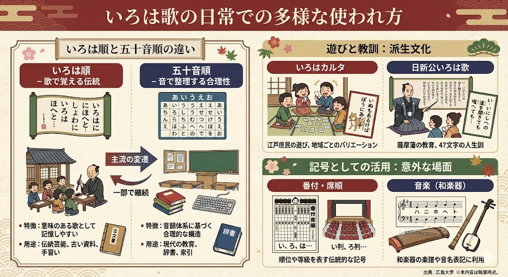 いろは歌は、単なる古典の一作品にとどまらず、「いろは順」という並びやカルタ、番付などさまざまな形で生活に入り込んできました。