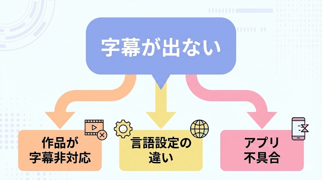 一言でいうと、「字幕が出ない」ときは、作品側の仕様か、設定の問題か、アプリの不具合かを切り分けるのが近道です。