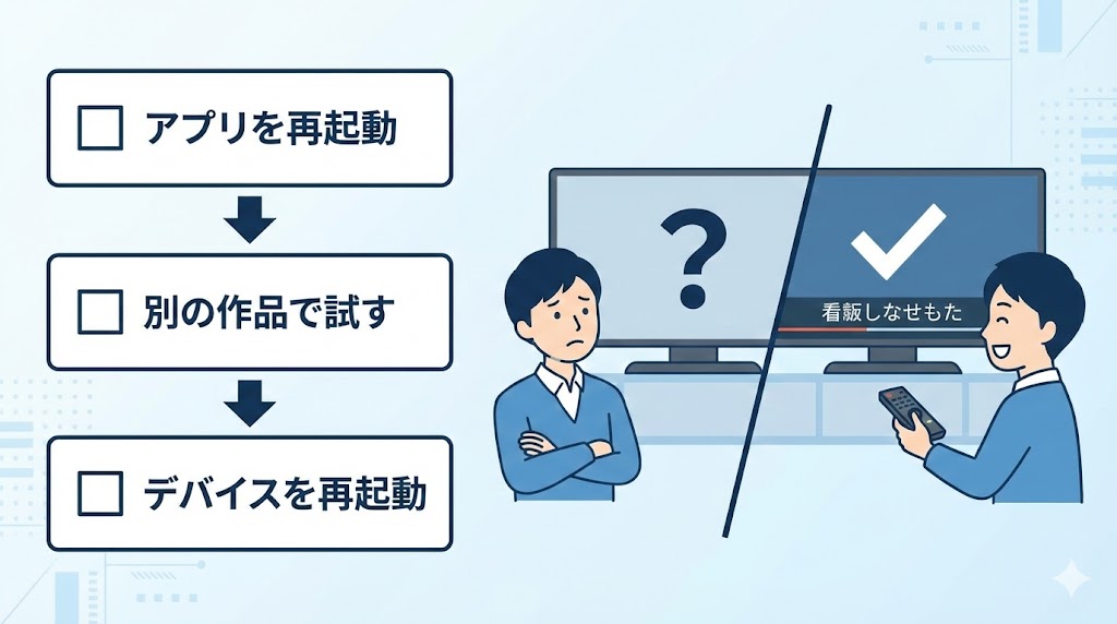 | 字幕メニュー自体が出ない | 作品が字幕非対応/アプリ不具合 | 別作品で字幕メニューが出るか試す |