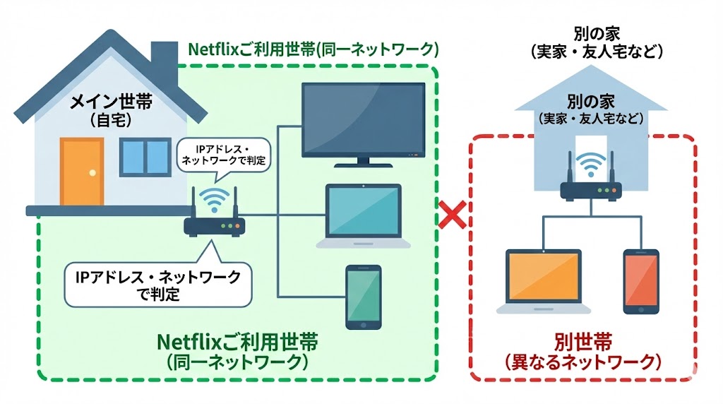 A. 同じ家に住む人向けの「Netflixご利用世帯」ルールが適用されたためです。別住所からの継続視聴が続くと、別世帯と判断されて制限されやすくなります。