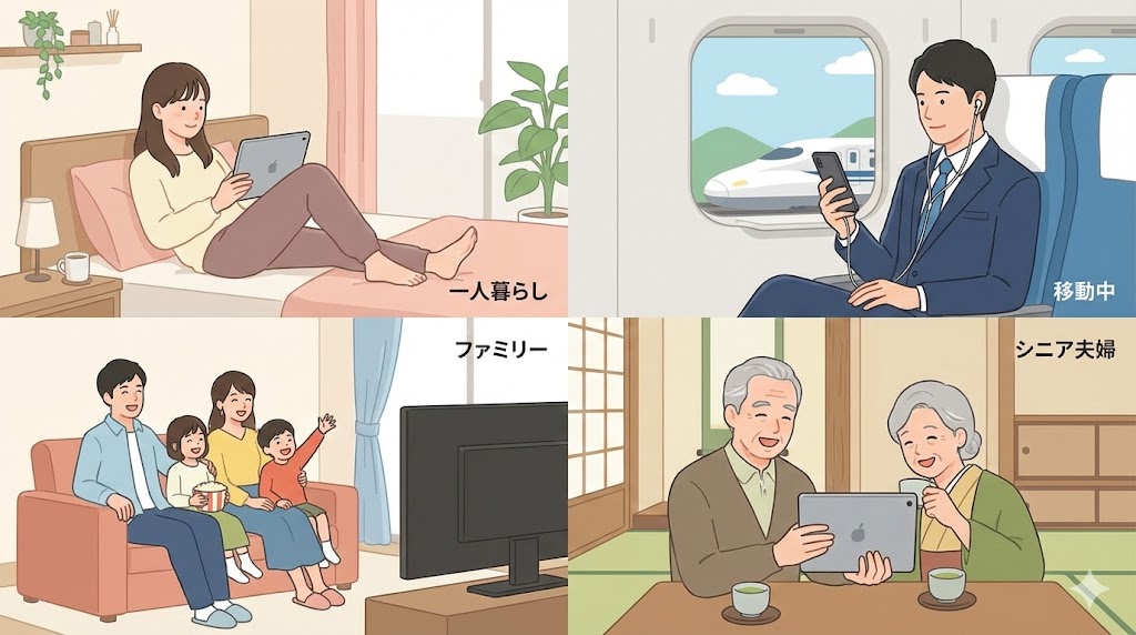 子育て世帯や三世代家族では、テレビ視聴とモバイル視聴が入り混じりやすくなります。