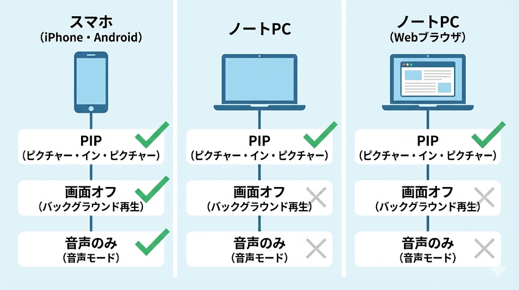 | デバイス種別 | 小窓再生(PIP)でのながら視聴 | 画面オフに近い使い方 | 完全な音声のみ再生 |