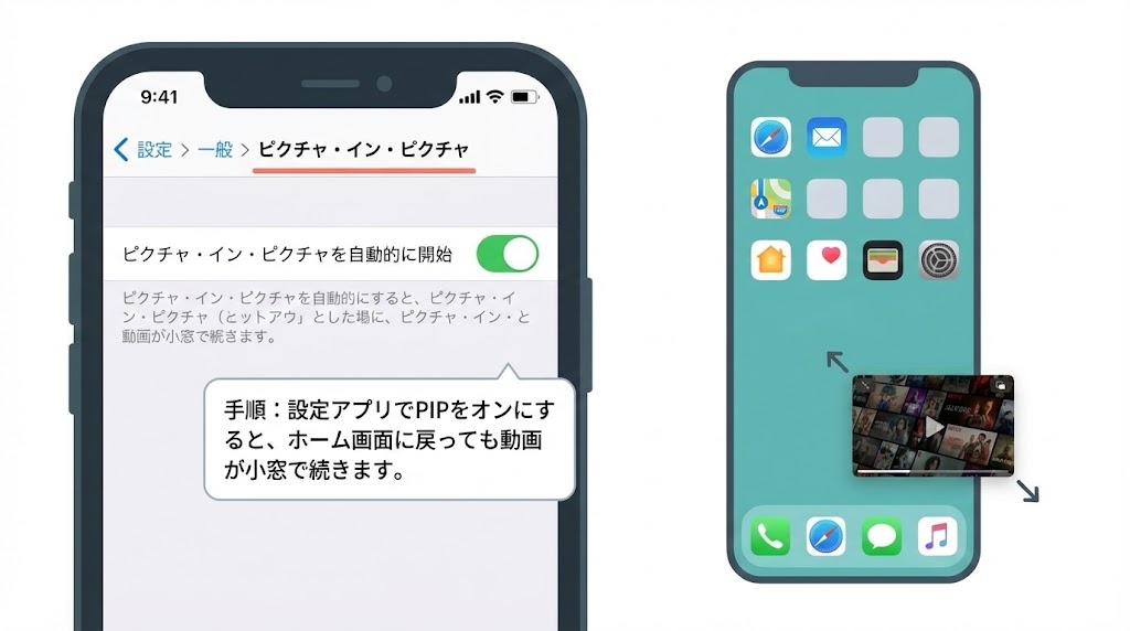 iPhone・iPadでPIPを使う場合、ポイントになるのは「OSバージョン」と「設定アプリのスイッチ」です。