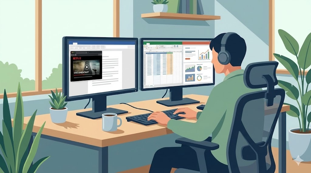 PCで作業している場合は、ブラウザのPIPやウィンドウ分割を活用して、動画ウィンドウを画面の端にそっと置いておくスタイルが定番です。