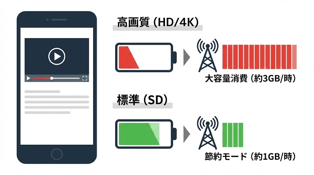 通勤中だけ少し見る程度なら標準画質でも十分という人も多いので、外出先は画質低め、自宅Wi-Fiでは高画質というように、シーン別に設定を切り替えておくと安心です。