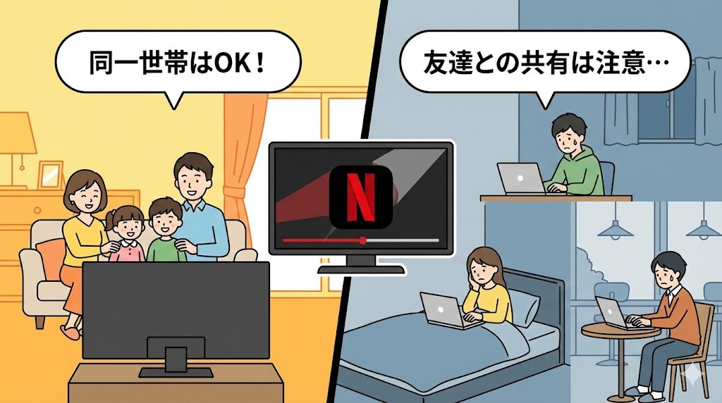 一言でいうと、Netflixは「同じ家に住んでいる人」の利用だけを想定しており、友達や離れて暮らす家族との共有は基本的にNGと考えるのが安全です。