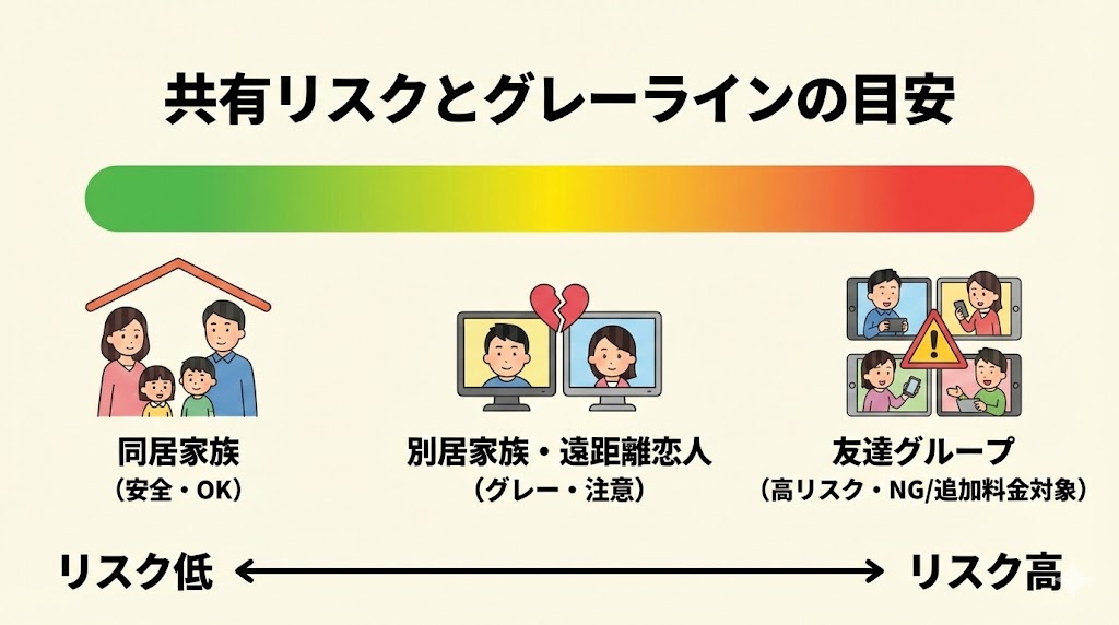 友達や別居家族との共有は、感覚的には身近でも、システムから見れば世帯外利用に近い動きになりやすいです。