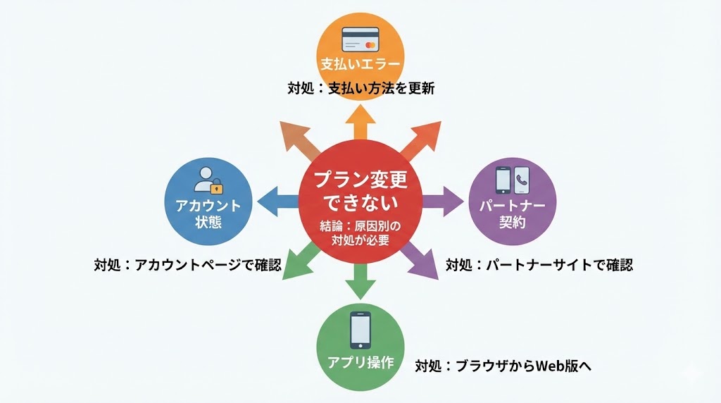 - プラン変更ができない原因は「支払いルート」「アプリ・デバイス」「アカウント状態」のどれかにほぼ絞られる