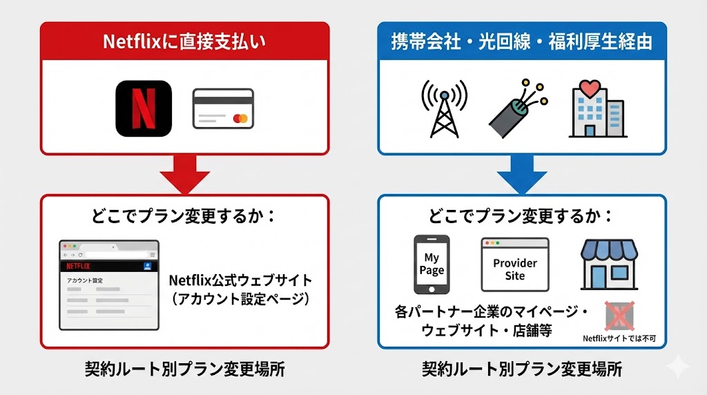 | 携帯会社・光回線・福利厚生経由の契約 | Netflixのアカウント画面に「プランの変更」リンクが出ない | 契約元(携帯会社・光回線・福利厚生サイト)のマイページから変更する |
