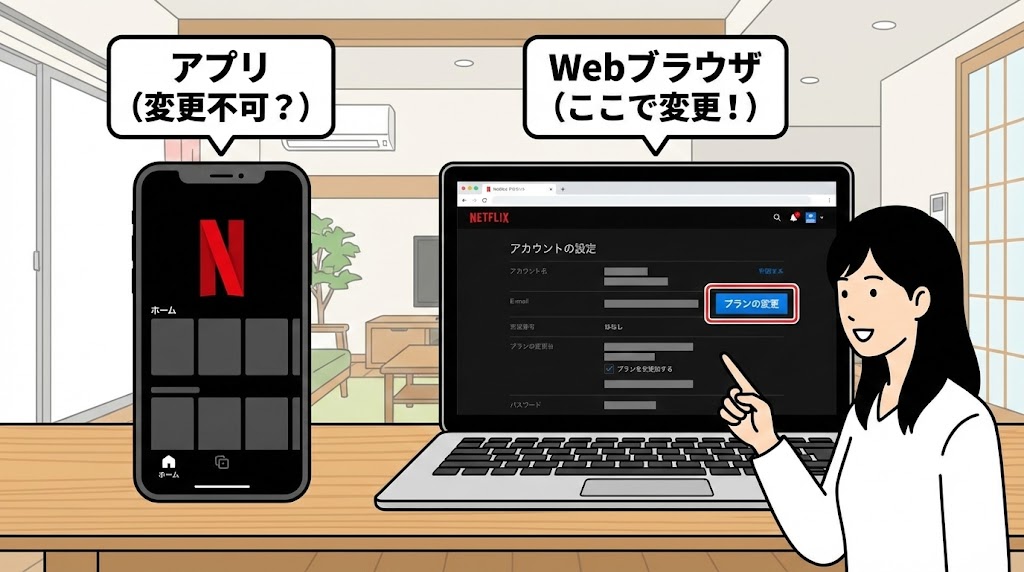 | スマホアプリから操作している | アプリの設定画面にプラン変更項目が見当たらない | アプリではなく、ブラウザでNetflix公式サイトにログインして操作する |