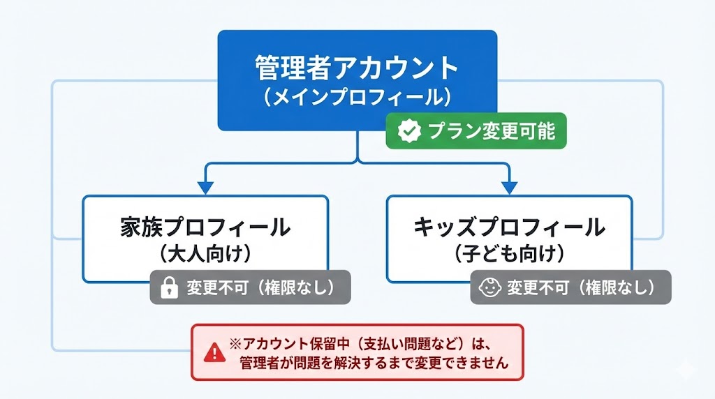 | キッズプロフィールや家族プロフィールから操作 | プラン変更のメニュー自体が見えない | 管理者プロフィール(契約者)でログインし直してから操作する |