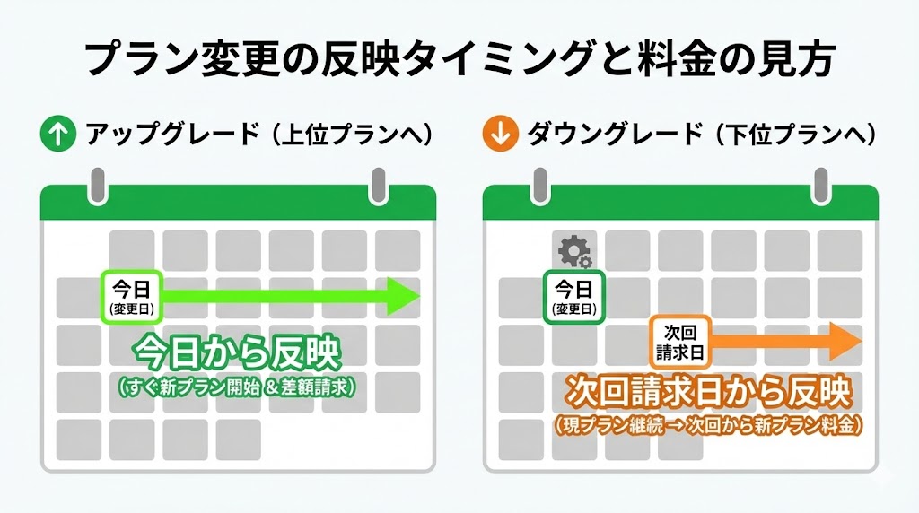 安い方への変更(ダウングレード)の場合は、原則として「次回の請求日」から新しいプランが反映されます。