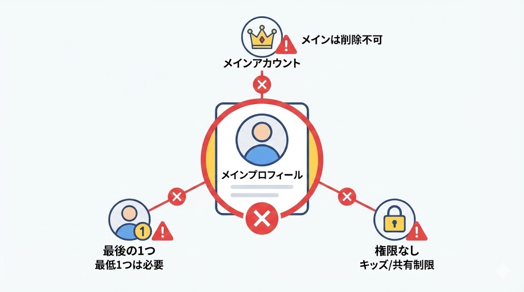 「削除できない」の多くはルール通りに動いているだけなので、焦って何度も同じボタンを押すより、プロフィール構成そのものを組み替える発想に切り替えた方が解決しやすいです。