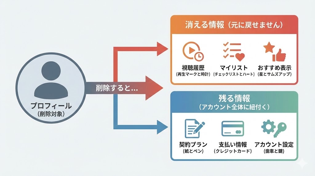 A. 削除したプロフィールの視聴履歴やマイリストは元に戻せない形で消えます。ただし、他のプロフィールの情報やアカウント自体の契約には影響しません。