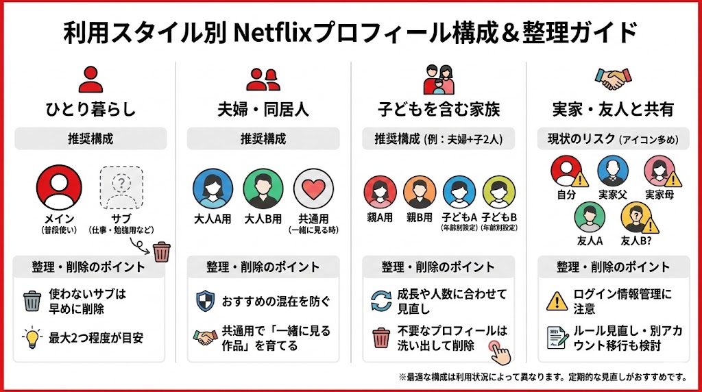 共有を続けるにしても、「誰がどのプロフィールを使うか」をはっきりさせたうえで、使っていないプロフィールだけ削除する、という順番で整理するのがスムーズです。