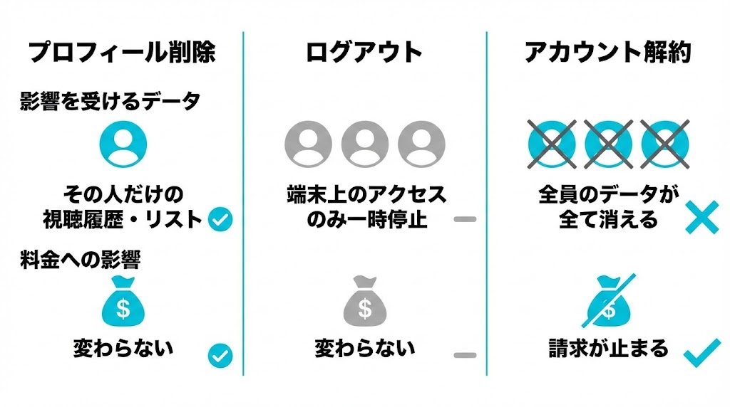 A. プロフィール削除は特定の人の視聴情報だけを消す操作で、解約はサービス利用自体を止める操作です。プロフィールを整理したいだけなら削除やログアウトで十分で、料金を止めたいときに解約を検討します。