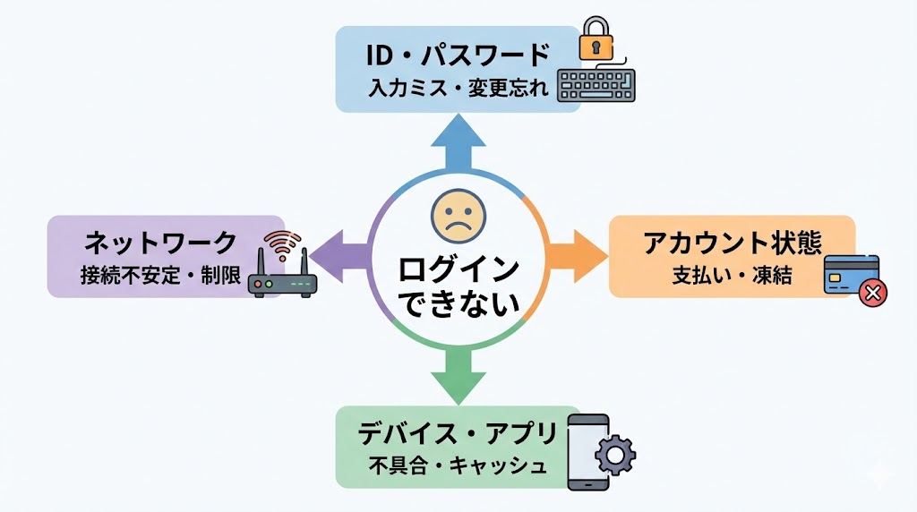 ログインIDの勘違い、アカウント状態の問題、デバイスやアプリ側の不調、ネットワークや一時的な制限の四つです。