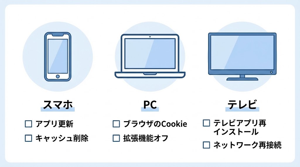この記事では、原因パターンを整理しながら、自分の状況に合わせて最短ルートで解決に近づくための手順を、スマホ・PC・テレビ別にわかりやすくまとめていきます。