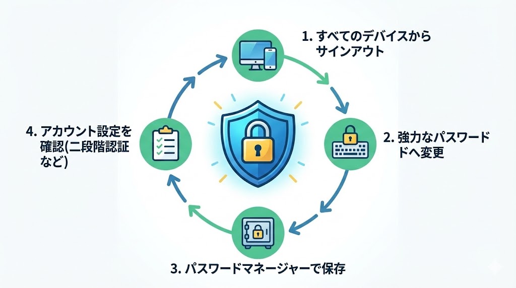 A. まずは全デバイスからサインアウトし、そのあとで強固なパスワードに一度だけ変更するのがおすすめです。 そのうえでパスワードマネージャーに保存し、他サービスとの使い回しを避けると安心度が高まります。