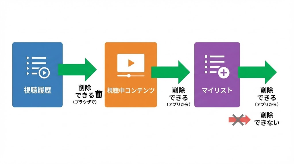 - 「視聴履歴」「視聴中コンテンツ」「マイリスト」は別物で、消せる場所とタイミングが違います。