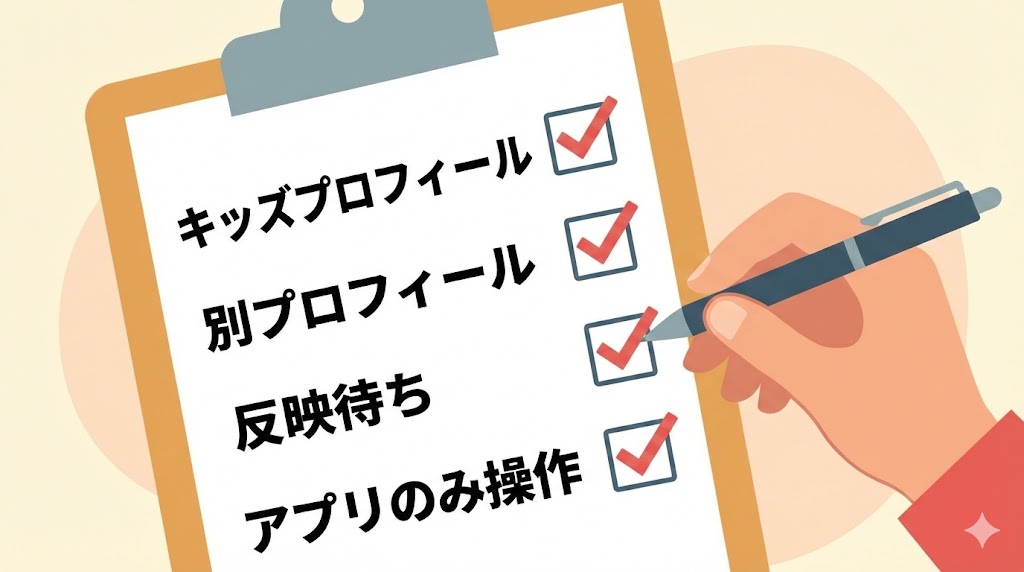 キッズプロフィールや別プロフィールの操作、反映までの時間、アプリだけで完結しない設定など、つまずきやすいポイントを知っておくと、「削除できない」という不安はかなり軽くなります。