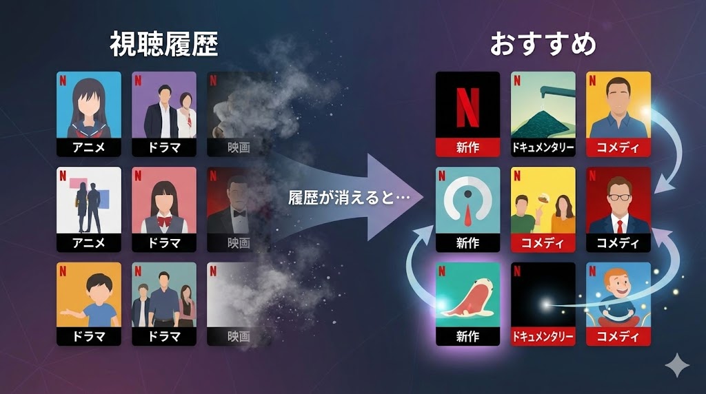 Netflixのレコメンドは、視聴履歴や評価をもとに「好みに合いそうな作品」を提示する仕組みになっています。