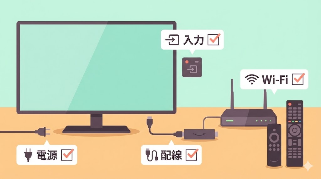 - まずは電源・配線・入力切替と、Wi-Fiの基本チェックからスタートする。