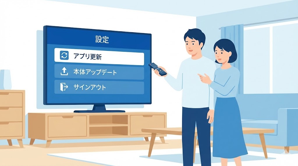 - スマートテレビか外部機器かで、アプリと本体のアップデートや再インストールを整理する。