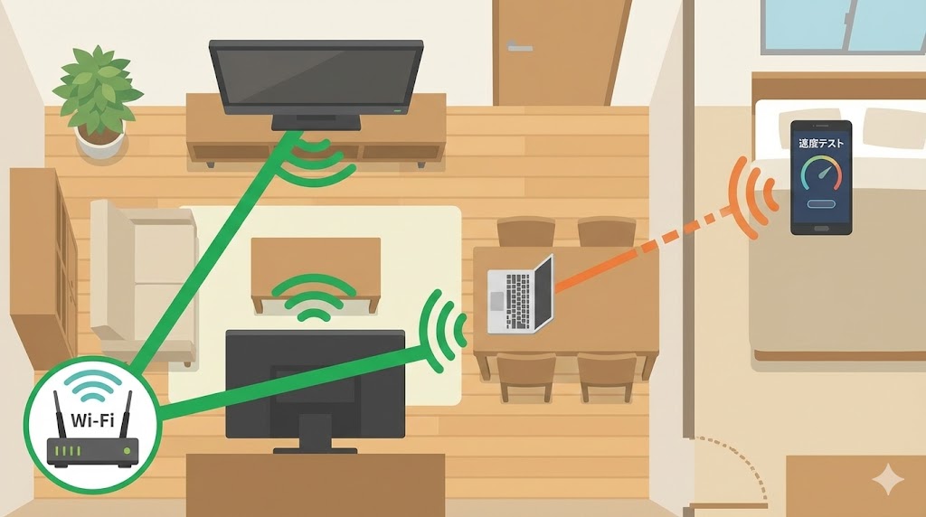 Wi-Fiは、ルーターとの距離や壁の数、電子レンジなどの家電の影響で、実際の速度が大きく変わります。