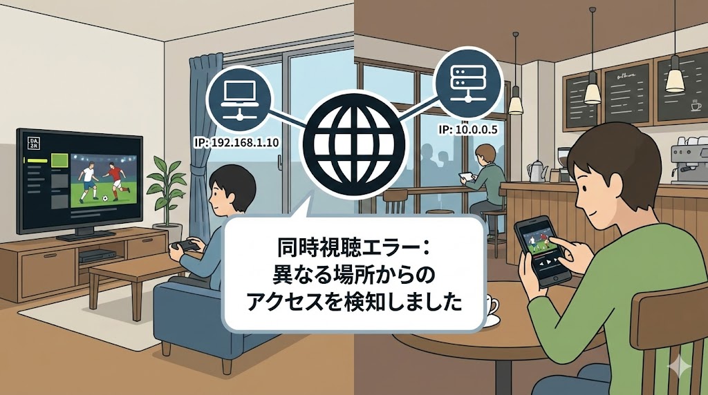 DAZNは、不正利用や過度な共有を防ぐために、同時視聴のIPアドレスに制限を設けています。