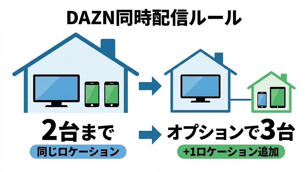 DAZNは、標準の利用条件として「1つのアカウントで1ロケーション2台まで同時視聴可能」というルールを採用しています。